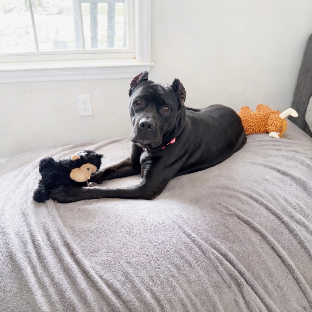 This gentle giant is a world class cuddler. She loves sunbathing in the yard, collecting her favorite toys for cozy bed play, and offering a tail wag that never seems to run out of batteries. Belly scratches are her love language, and she has done wonderfully meeting new people and spending time around other dogs.