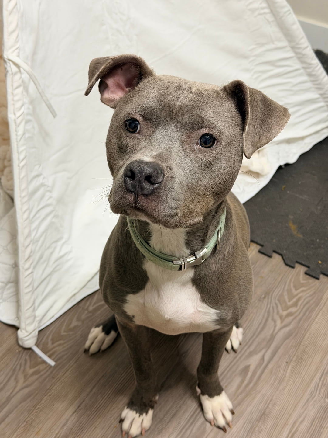 Dilly is a super sweet boy, loves to play, cuddle, and be super close to his human. He doesn’t know what personal space is and really wants a best friend. He would do best with a back yard and another furry friend. He is very food protective so he has to be feed away from other dogs . He does great with training. He is timid at first but warms up fast! He just wants to be loved and give as many licks as he can. He gets along with other dogs but needs slow intro
