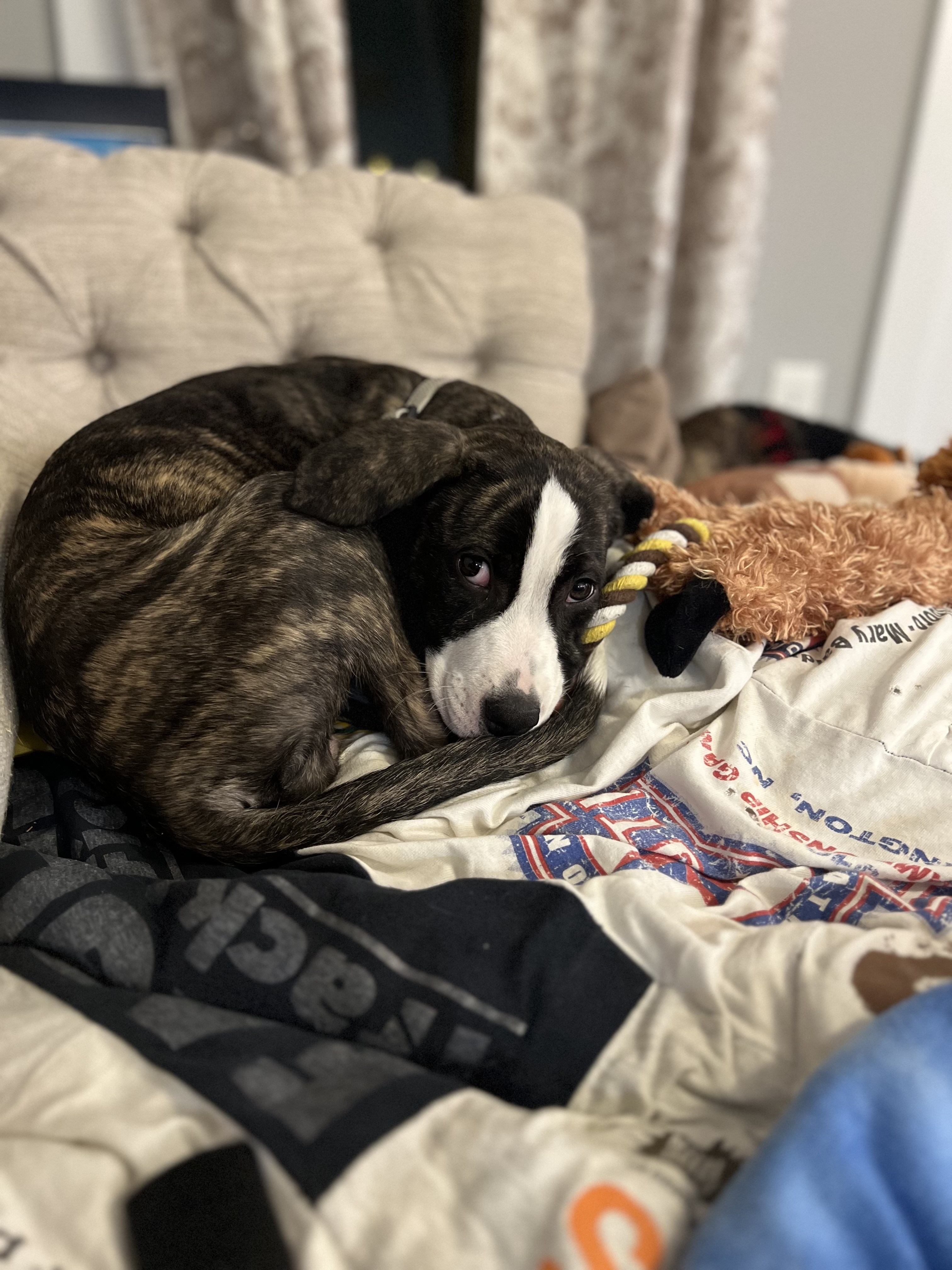 She loves lounging by your side, soaking up calm moments, and settling in for cozy naps throughout the day. Give her a chew toy and a comfy spot, and she’s one happy pup!
